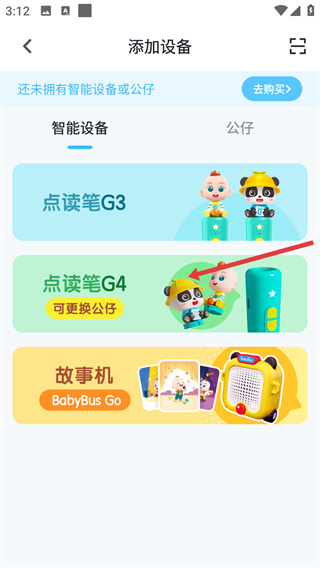 3、在添加設(shè)備頁(yè)面選擇【點(diǎn)讀筆G4】,進(jìn)入點(diǎn)讀筆添加流程。