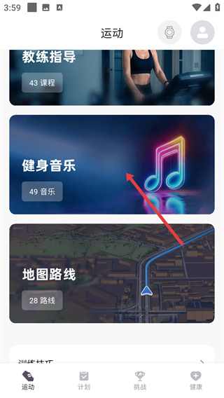 2、在運(yùn)動(dòng)頁(yè)面點(diǎn)擊【健身音樂】,進(jìn)入健身音樂分類頁(yè)面,可瀏覽各類健身音樂。