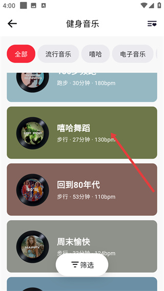 3、在健身音樂分類頁(yè)面選擇心儀音樂(如【嘻哈舞蹈】),進(jìn)入音樂詳情頁(yè)面。
