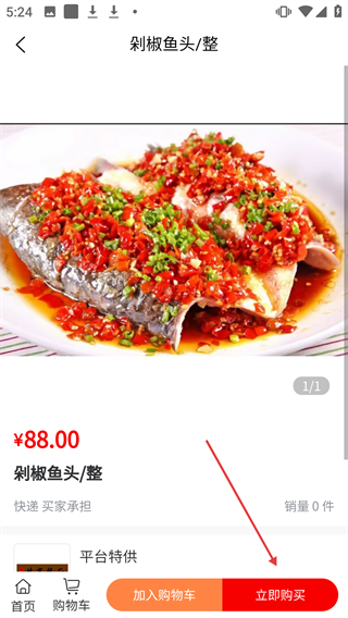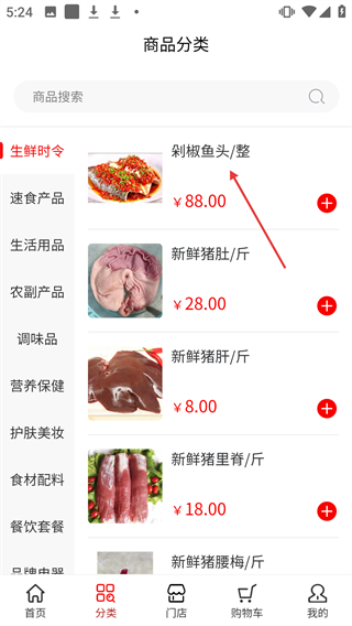 2、在【生鮮時令】分類下,點擊【剁椒魚頭/整】,進入商品詳情頁。
