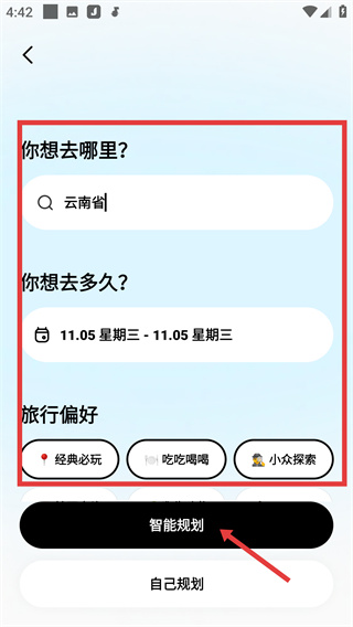 3、設置【目的地】【旅行時間】并選擇【旅行偏好】后,點擊【智能規(guī)劃】,啟動行程生成功能。