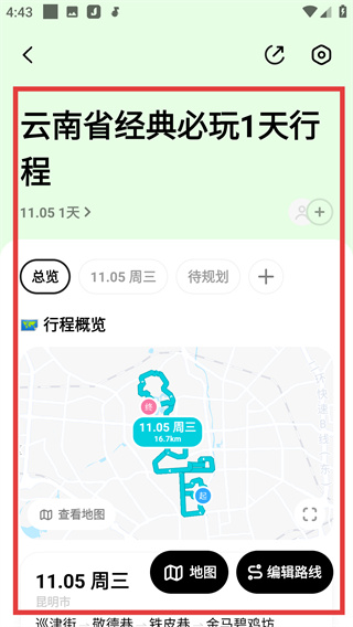 4、系統(tǒng)生成后,可查看如【云南省經(jīng)典必玩1天行】的行程詳情,可進一步編輯路線或查看地圖。