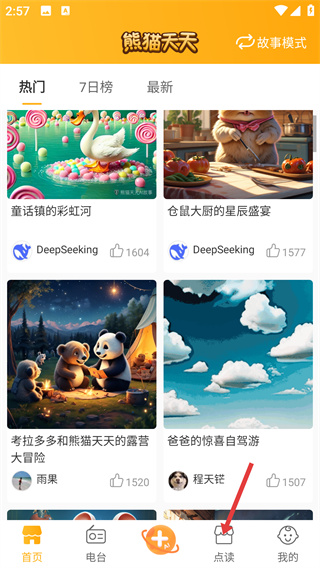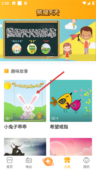 1、在熊貓?zhí)焯焓醉?yè)點(diǎn)擊底部的【點(diǎn)讀】選項(xiàng),進(jìn)入點(diǎn)讀功能頁(yè)面,可瀏覽趣味故事等內(nèi)容板塊。