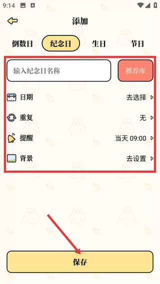4、在添加頁面的【紀念日】分類下,填寫名稱、選擇日期等信息后,點擊底部的【保存】按鈕完成紀念日的添加。
