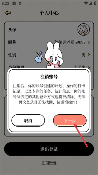 3、在注銷賬號的提示彈窗中,閱讀注銷相關(guān)后果后點擊【下一步】按鈕,進入更詳細的注銷確認環(huán)節(jié)。
