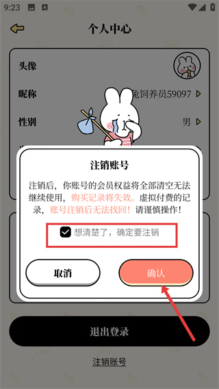 4、在注銷確認環(huán)節(jié)勾選【想清楚了,確定要注銷】選項,再點擊【確認】按鈕,完成賬號的注銷操作。