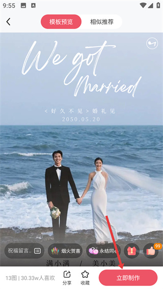 1、在搜索頁面選擇【婚禮邀請(qǐng)】分類,找到目標(biāo)模板并點(diǎn)擊,進(jìn)入該模板的預(yù)覽頁面。