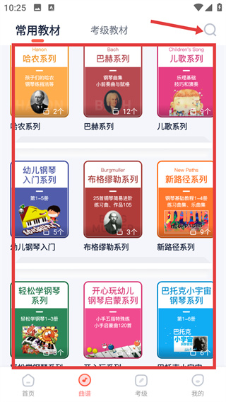 2、在曲譜頁面直接搜索或選擇常用教材、考級教材分類,分類底下選擇心儀的系列,進(jìn)入該系列的教材分冊列表頁面。