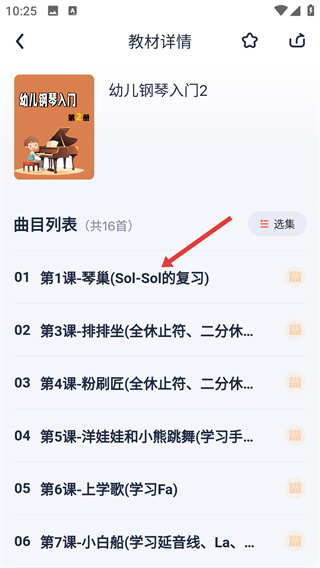 4、在教材詳情頁面的曲目列表里,選擇【第1課-琴巢(Sol-Sol的復(fù)習(xí))】,可查看該曲目的詳細(xì)內(nèi)容。