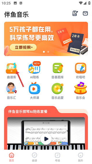 1、在【伴魚音樂】首頁點擊【曲譜庫】選項,進(jìn)入曲譜頁面。
