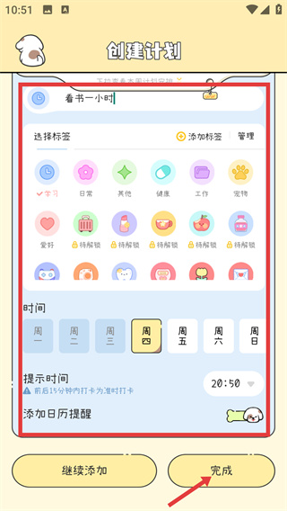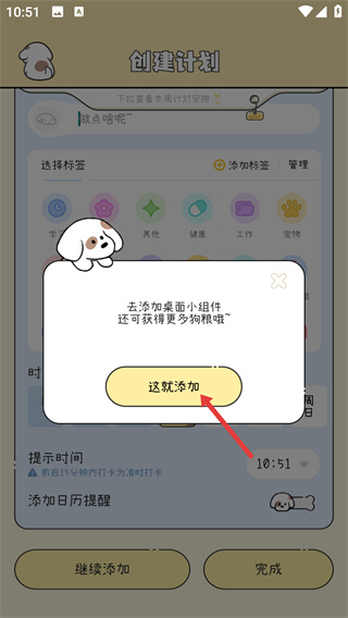 2、在創(chuàng)建計劃頁面填寫內(nèi)容、選好標(biāo)簽與時間后,點(diǎn)擊“完成”按鈕,觸發(fā)添加桌面小組件的提示彈窗。
