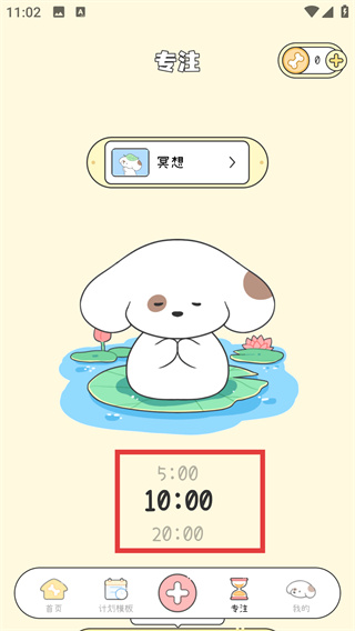 4、切換到冥想類型的專注頁面后,在【10:00】的時(shí)長(zhǎng)區(qū)域進(jìn)行時(shí)間調(diào)整,確定專注計(jì)時(shí)的時(shí)長(zhǎng)參數(shù)。