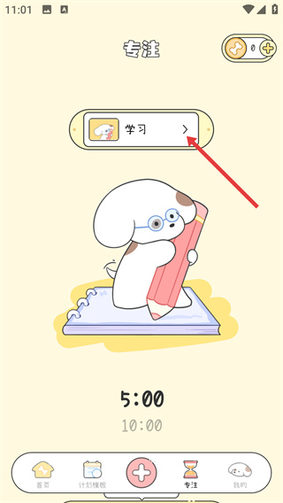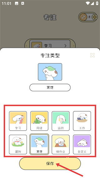 2、在專注頁面點(diǎn)擊當(dāng)前顯示的【學(xué)習(xí)】區(qū)域,彈出專注類型選擇的彈窗,可挑選不同的專注類別。