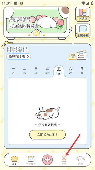 1、在首頁底部點(diǎn)擊【專注】選項(xiàng),進(jìn)入專注功能頁面,可進(jìn)行專注類型與時(shí)長(zhǎng)的設(shè)置操作。