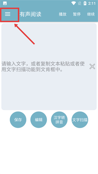 1、在【有聲閱讀】頁(yè)面點(diǎn)擊左上角三橫線菜單按鈕,打開功能列表。
