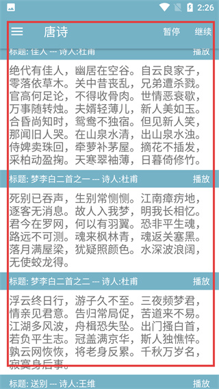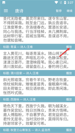 4、在【唐詩(shī)】頁(yè)面找到目標(biāo)詩(shī)作,點(diǎn)擊其旁【播放】按鈕,啟動(dòng)該詩(shī)作的有聲閱讀。