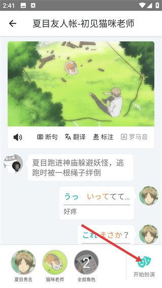 2、在劇集詳情頁查看臺詞內(nèi)容,選擇對應(yīng)角色后,點擊底部“開始扮演”按鈕,進入演出陣容的配置環(huán)節(jié)。