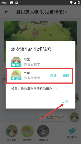 3、在彈出的“本次演出的出場陣容”彈窗中,確認(rèn)角色扮演者配置,點擊“出演”按鈕,進入臺詞演繹頁面。