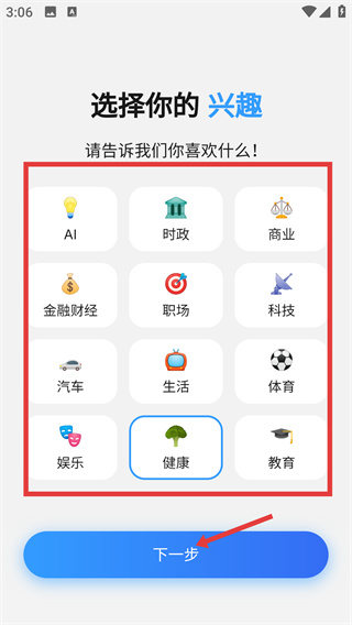 1、在興趣選擇頁面,挑選目標(biāo)興趣分類,點(diǎn)擊“下一步”按鈕,進(jìn)入頻道訂閱環(huán)節(jié)。