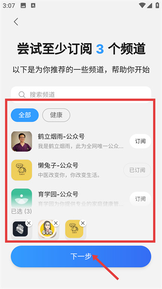 2、進(jìn)入頻道訂閱頁面后,按要求訂閱至少3個(gè)頻道,確認(rèn)訂閱完成后點(diǎn)擊“下一步”,完成內(nèi)容偏好的初始化配置。