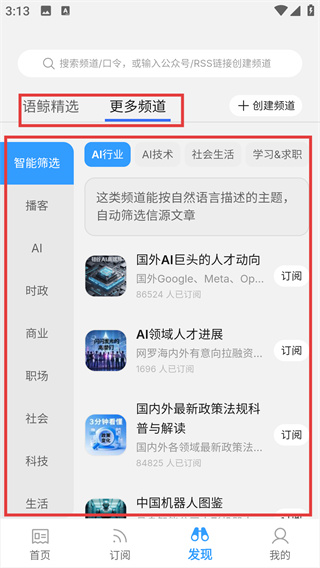4、切換到“發(fā)現(xiàn)”頁面,在“更多頻道”板塊瀏覽不同分類的頻道,可按需訂閱新的內(nèi)容頻道。
