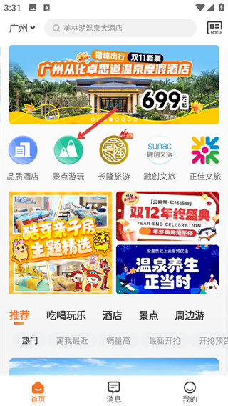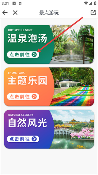1、在首頁(yè)點(diǎn)擊“景點(diǎn)游玩”選項(xiàng),進(jìn)入景點(diǎn)游玩分類(lèi)頁(yè)面,可選擇溫泉泡湯、主題樂(lè)園等不同類(lèi)型的游玩項(xiàng)目。