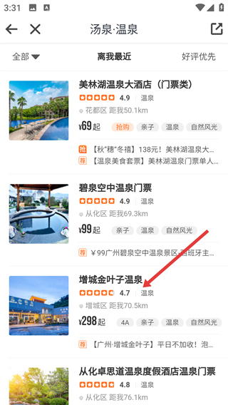 3、在湯泉·溫泉列表中選擇目標(biāo)項(xiàng)目,進(jìn)入該溫泉項(xiàng)目的詳情頁(yè)面查看套餐信息。