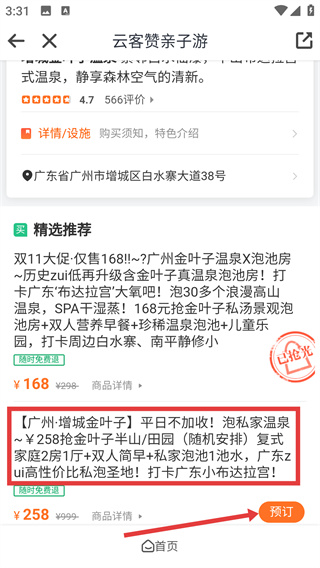 4、在項(xiàng)目詳情頁(yè)面選定目標(biāo)套餐后,點(diǎn)擊“預(yù)訂”按鈕,推進(jìn)該溫泉套餐的預(yù)訂流程。
