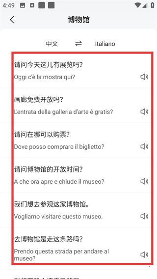 3、在翻譯的場(chǎng)景分類中選定【博物館】,查看該場(chǎng)景下的多組中文-意大利語雙語翻譯句子,覆蓋不同溝通需求。