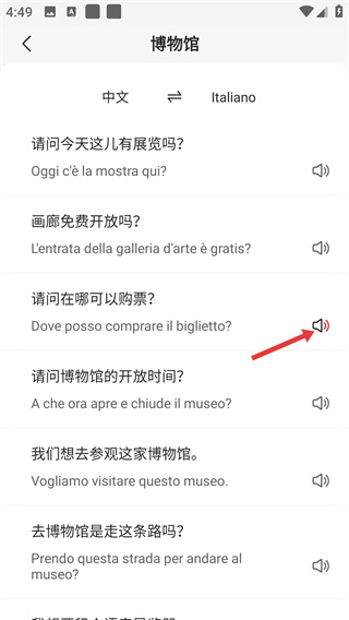 4、在博物館場(chǎng)景的翻譯句子旁,點(diǎn)擊發(fā)音按鈕,可播放對(duì)應(yīng)外語句子的語音朗讀,輔助學(xué)習(xí)發(fā)音。