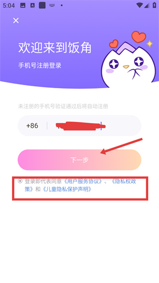 2、在飯角的注冊登錄頁面填寫手機號,勾選相關協(xié)議后點擊【下一步】按鈕,進入驗證碼驗證環(huán)節(jié)。