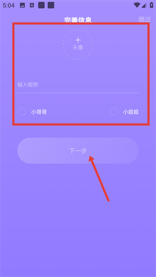4、在完善信息頁面,設置頭像、輸入昵稱并選擇稱呼后,點擊【下一步】按鈕完成賬號注冊操作。