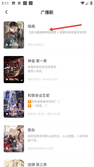 1、在廣播劇列表頁面選擇《暗癮》,進(jìn)入該廣播劇的詳情頁面。