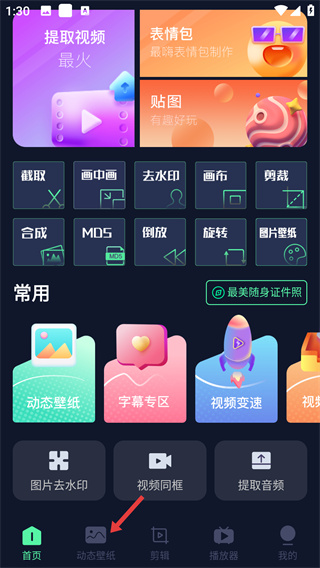 1、在首頁底部點擊【動態(tài)壁紙】選項,進入對應頁面,可查看【動態(tài)壁紙】等功能的入口區(qū)域。
