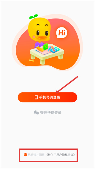 2、在登錄界面,勾選“已閱讀并同意《杜丫丫用戶隱私協(xié)議》”后,點擊【手機號碼登錄】按鈕,進入手機登錄頁面。