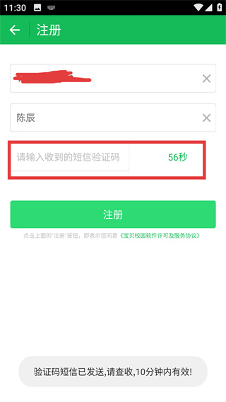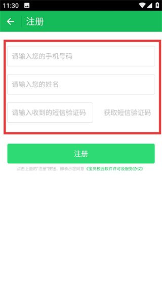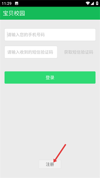 1、在【寶貝校園】登錄頁面,點(diǎn)擊底部的【注冊】按鈕,進(jìn)入賬號注冊界面,準(zhǔn)備填寫注冊相關(guān)信息。