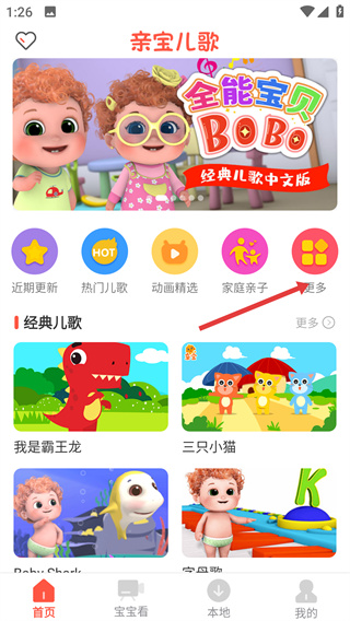 1、在【親寶兒歌】首頁(yè),點(diǎn)擊功能欄中的【更多】選項(xiàng),進(jìn)入內(nèi)容分類(lèi)更豐富的【寶寶看】頁(yè)面。