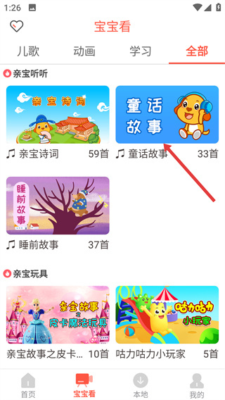 2、在【寶寶看】頁(yè)面,選擇【童話故事】分類(lèi)卡片,進(jìn)入該分類(lèi)下的內(nèi)容列表,準(zhǔn)備選擇具體故事。