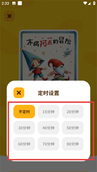 3、在故事播放界面,點(diǎn)擊左下角的定時(shí)圖標(biāo),可打開定時(shí)設(shè)置彈窗,調(diào)整播放時(shí)長。