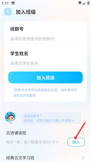 3、在加入班級(jí)界面,可填寫班群號(hào)與學(xué)生姓名,或選擇公共班點(diǎn)擊【加入】。