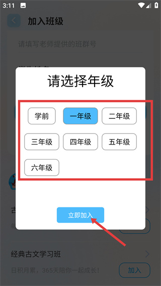 4、選擇公共班后,在年級(jí)選擇彈窗中選定對(duì)應(yīng)年級(jí),點(diǎn)擊【立即加入】即可完成班級(jí)加入。