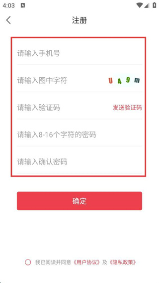 4、在注冊(cè)頁(yè)面中,依次填寫(xiě)【請(qǐng)輸入手機(jī)號(hào)】、驗(yàn)證字符、驗(yàn)證碼、密碼及確認(rèn)密碼,完成信息填寫(xiě)后可提交注冊(cè)。