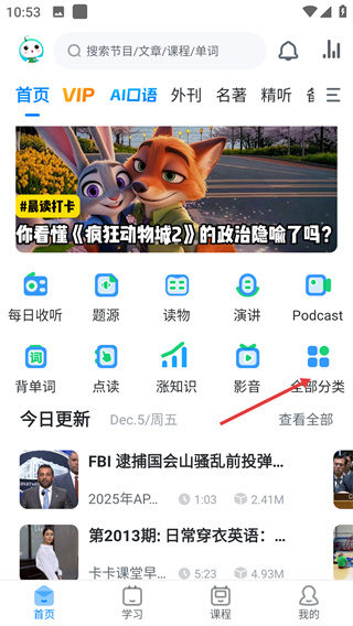 1、在APP首頁點(diǎn)擊【全部分類】選項(xiàng),進(jìn)入涵蓋多類學(xué)習(xí)內(nèi)容的分類頁面,可選擇不同學(xué)習(xí)板塊。