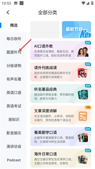 2、在全部分類頁面點(diǎn)擊左側(cè)【題源外刊】分類,進(jìn)入該類別下的外刊資源列表頁面,瀏覽各類外刊內(nèi)容。