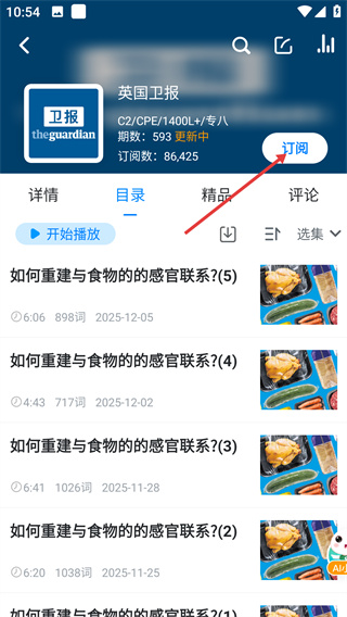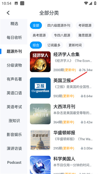 3、在題源外刊列表中選擇【英國衛(wèi)報(bào)】條目,進(jìn)入該外刊的專屬內(nèi)容頁面,查看其更新的音頻等內(nèi)容。