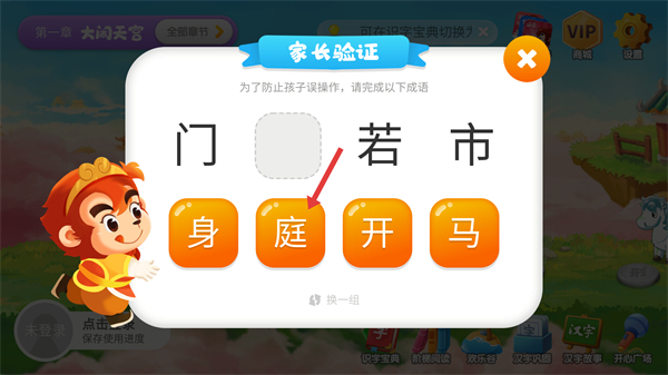 2、遇到【家長(zhǎng)驗(yàn)證】彈窗時(shí),選擇對(duì)應(yīng)漢字“庭”,完成“門庭若市”的成語(yǔ)填空以通過驗(yàn)證。