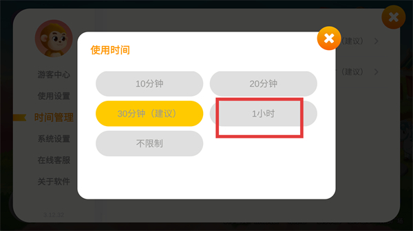 4、在【使用時(shí)間】選擇彈窗中,可挑選10分鐘、1小時(shí)等時(shí)長(zhǎng),完成該軟件單次使用時(shí)長(zhǎng)的設(shè)置。