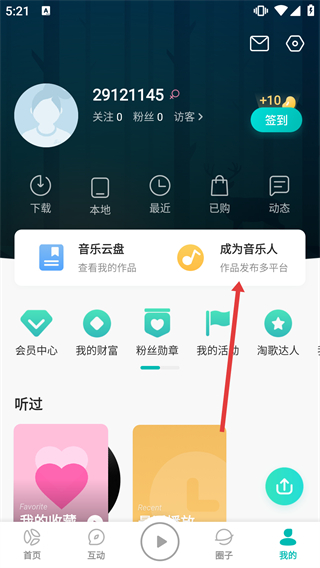 2、在個人中心頁面,找到“成為音樂人”選項并點擊,進入5sing音樂的平臺介紹頁面。