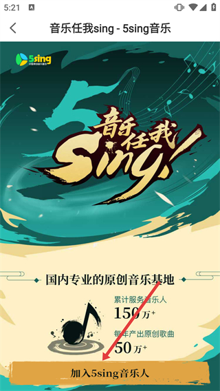 3、在5sing音樂介紹頁面,點擊“加入5sing音樂人”按鈕,進入音樂人入駐的身份選擇頁面。