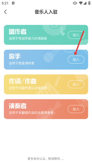 4、在音樂人入駐頁面,選擇對應身份(如“歌手”),點擊該身份右側(cè)的“加入”按鈕,完成對應音樂人的入駐申請操作。
